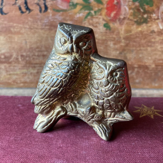 Vintage Solid Brass Owls On A Branch Figurine From India